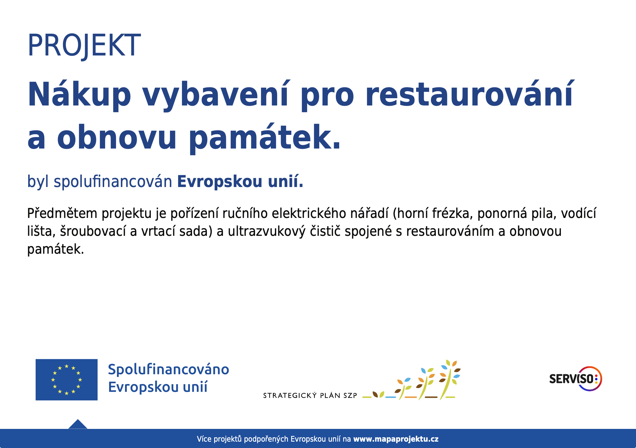 V roce 2026 jsem realizoval nákup nástrojů s podporou evropských fondů. Jedná se o horní frézku, ponornou pilu, vodící lišty, ultrazvukový čistič, šroubovací a vrtací sadu a mobilní vysavač. Tyto nástroje používám při restaurování historických dveří a jiných uměleckořemeslně zpracovaných prvků ze dřeva a kovu. Umožňuje mi to efektivně pracovat na místě realizace a snadněji vyspravovat poškozený materiál.